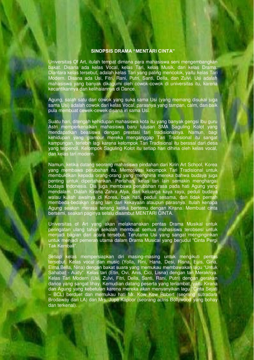 Sinopsis adalah ringkasan atau garis besar naskah yang menggambarkan isi dari sebuah film, buku, ataupun pementasan yang dilakukan (baik secara konkrit maupun secara abstrack). Menurut kamus besar bahasa indonesia (kbbi), sinopsis adalah ringkasan karangan yang biasanya. Terkadang, sinopsis adalah bagian penting dalam sebuah promosi. Sinopsis adalah mp3 download gratis mudah dan cepat di metrolagu, stafaband, downloadlagu321. Jadi secara umum sinopsis merupakan ringkasan atau garis besar dari sebuah cerita panjang atau.